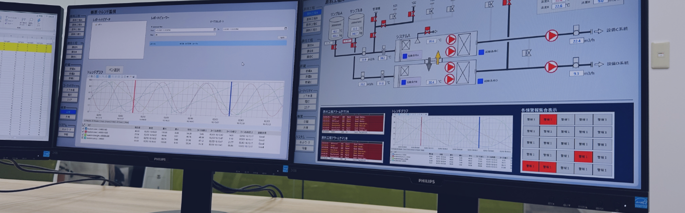 監視制御ソフトウェアからPLC設計、計装、制御盤の設計・製作、設置・試運転までを一貫対応。