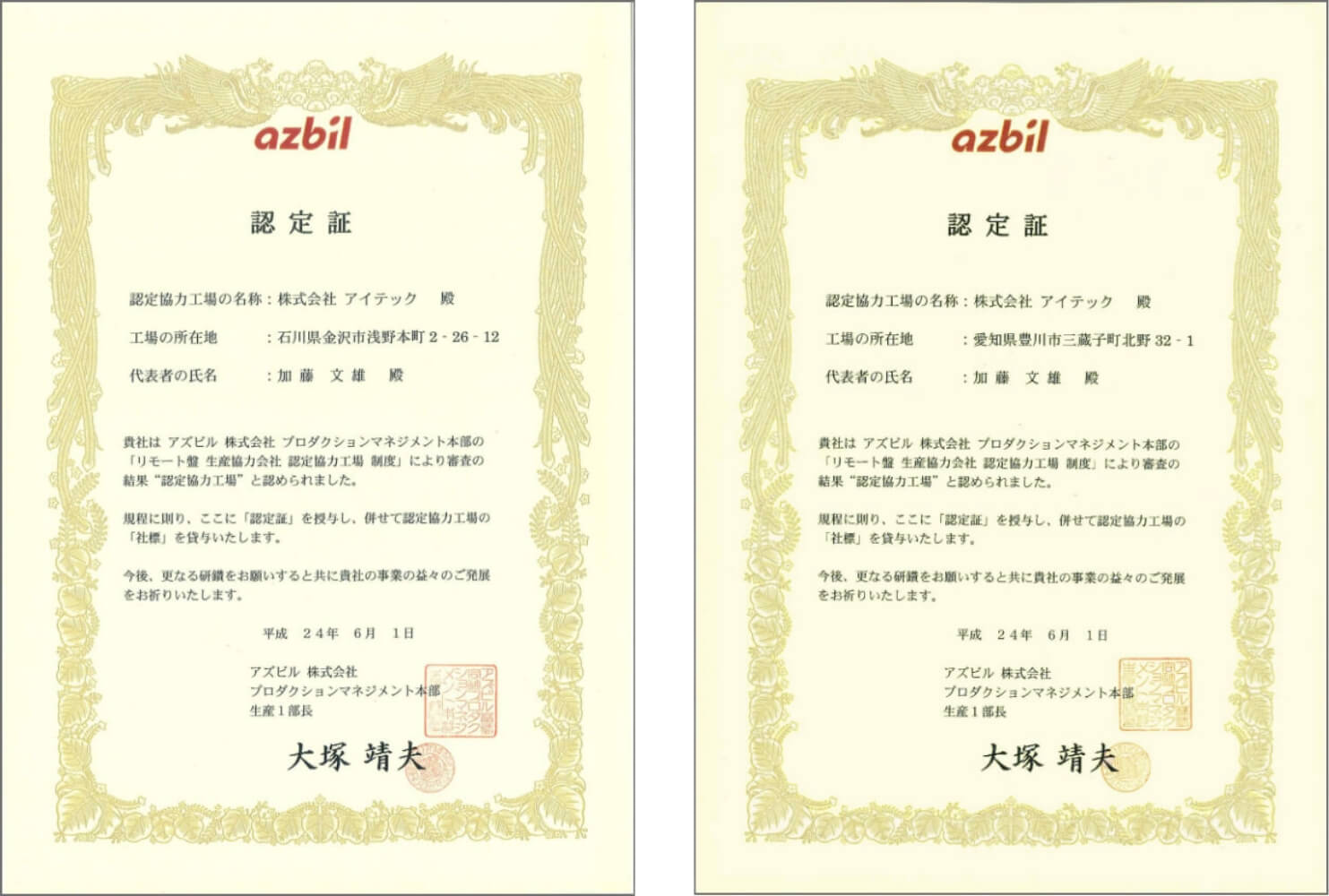 アズビル株式会社の認定協力工場に指定/1999年2月