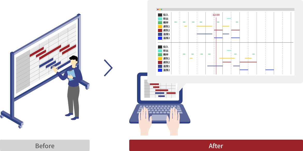自治体が運営する施設において、汚水処理や発酵装置の運転スケジュール工程を視覚的に把握したいというニーズがありました。これまでは紙やエクセルなどアナログな方法で運転スケジュールを管理していましたが、無駄のない効率的なスケジュールを実現したいというニーズがありました。