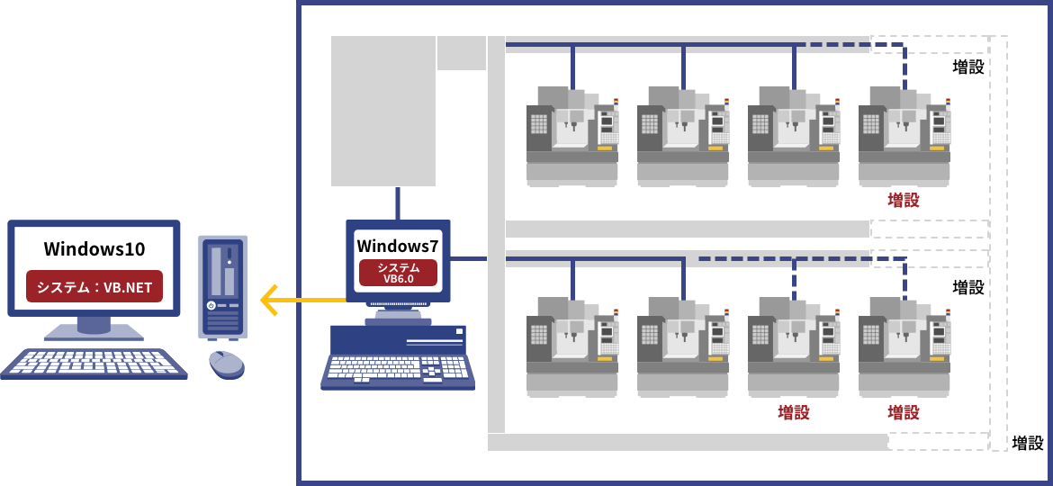 弊社で導入したFAシステムを運用していただいている金属加工事業者様からのご依頼です。導入から数年が経つタイミングで工場を増設することになったため、既存のFAシステムと合流させて工場全体の能力を向上させたいとのことでした。現在使用されているPCはOSが古いため、PCごと更新する必要がありました。