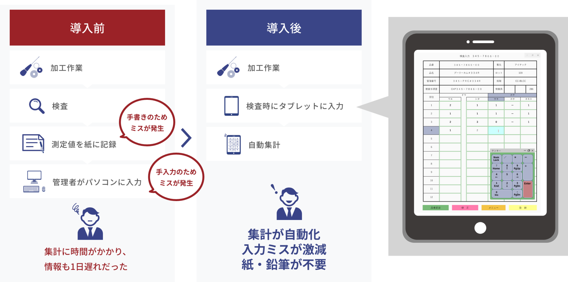 ペーパーレス化、オンライン化と聞くと、データ管理の便利さ集計の自動化、作業時間の短縮化がメリットとして挙げられますが、ゴミの削減や省人化なども生み出します。町工場など小規模な製造現場ではこのようなデータのペーパーレス化、オンライン化がなかなか進んでいないのが現状です。今回のような事例では、タブレットやPCはそれほどハイスペックなものでなくても十分ですので、低コストで電子化を進めたいとお考えの方はお気軽にご相談ください。